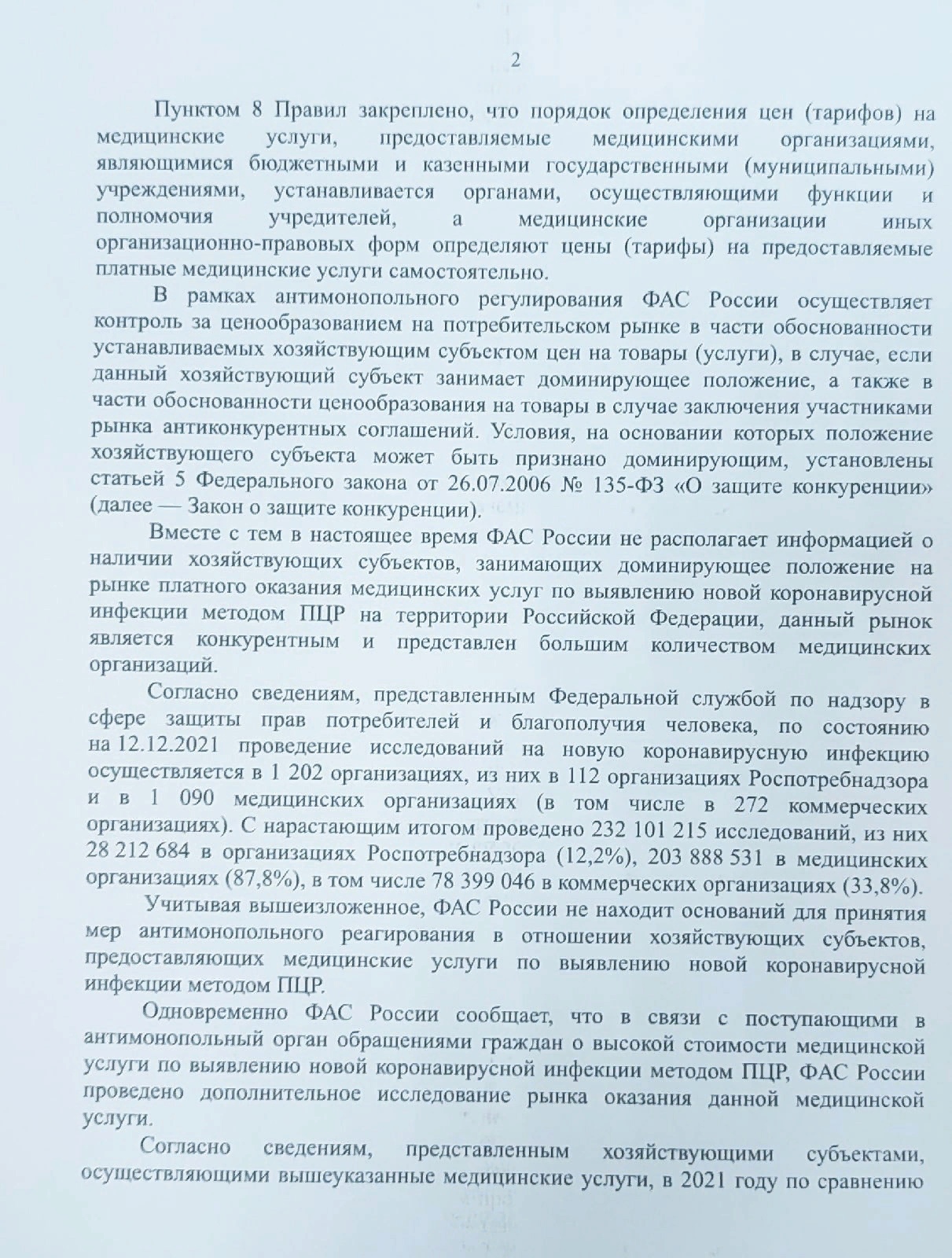 "Мое предложение было ориентировано конкретно на коммерческие организации, ФАС дала ответ в общем. Мне, как врачу, известна себестоимость ПЦР - тестирования, поэтому аргументы о невозможности снизить цены в связи со значительными затратами на проведение процедуры, далеки от реальности. В целом ответ ФАС к сути моей инициативы не относится. Налицо простое нежелание представителей госоргана заниматься этим вопросом ", - отметил Сергей Леонов.