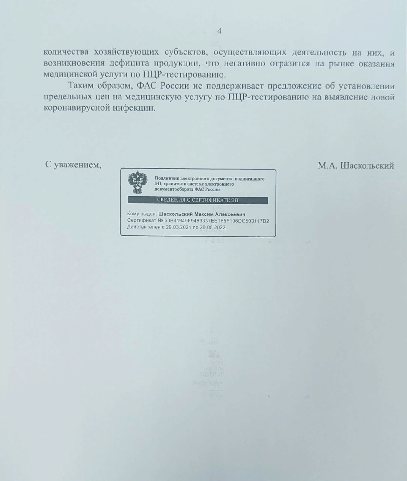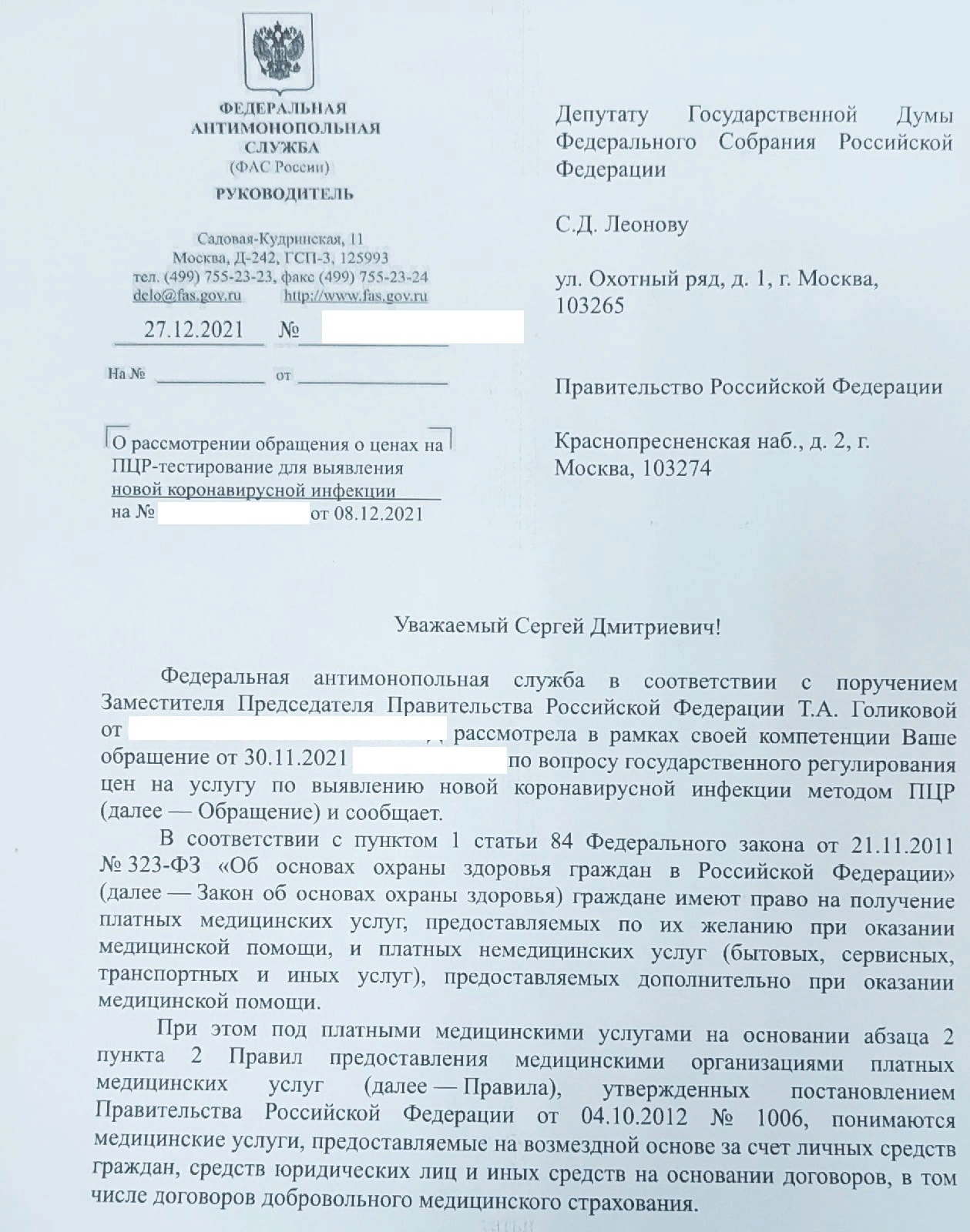 Член фракции ЛДПР в Государственной Думе, врач - иммунолог Сергей Леонов получил ответ от Федеральной антимонопольной службы по поводу введения государственного регулирования стоимости ПЦР - тестов на COVID - 19. Ранее парламентарий направил письмо вице-премьеру Татьяне Голиковой, предложив ограничить стоимость тестов на коронавирус до 1 тысячи рублей