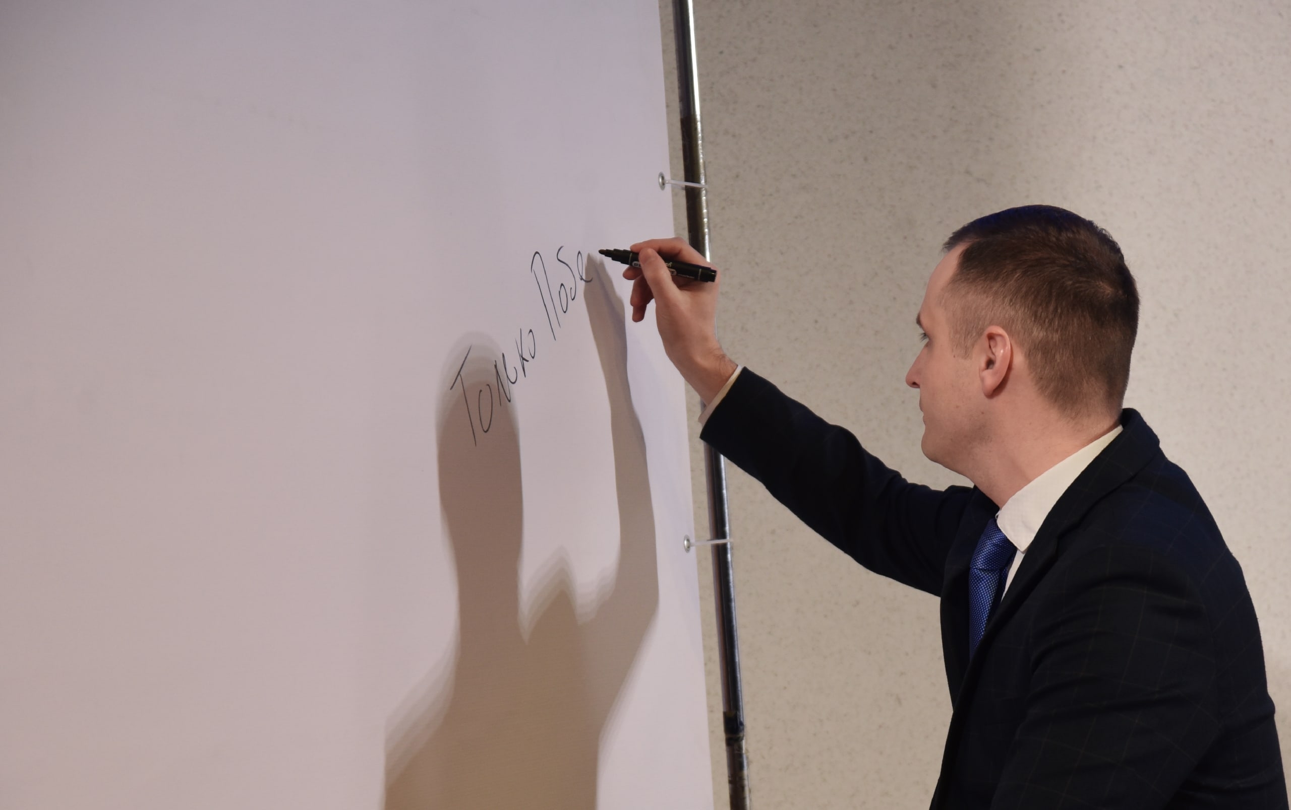 «Только Победа!». После лекции для слушателей Высшей партийной школы ЛДПР депутат Госдумы Сергей Леонов написал эту фразу на специальном баннере, подготовленном для спикеров