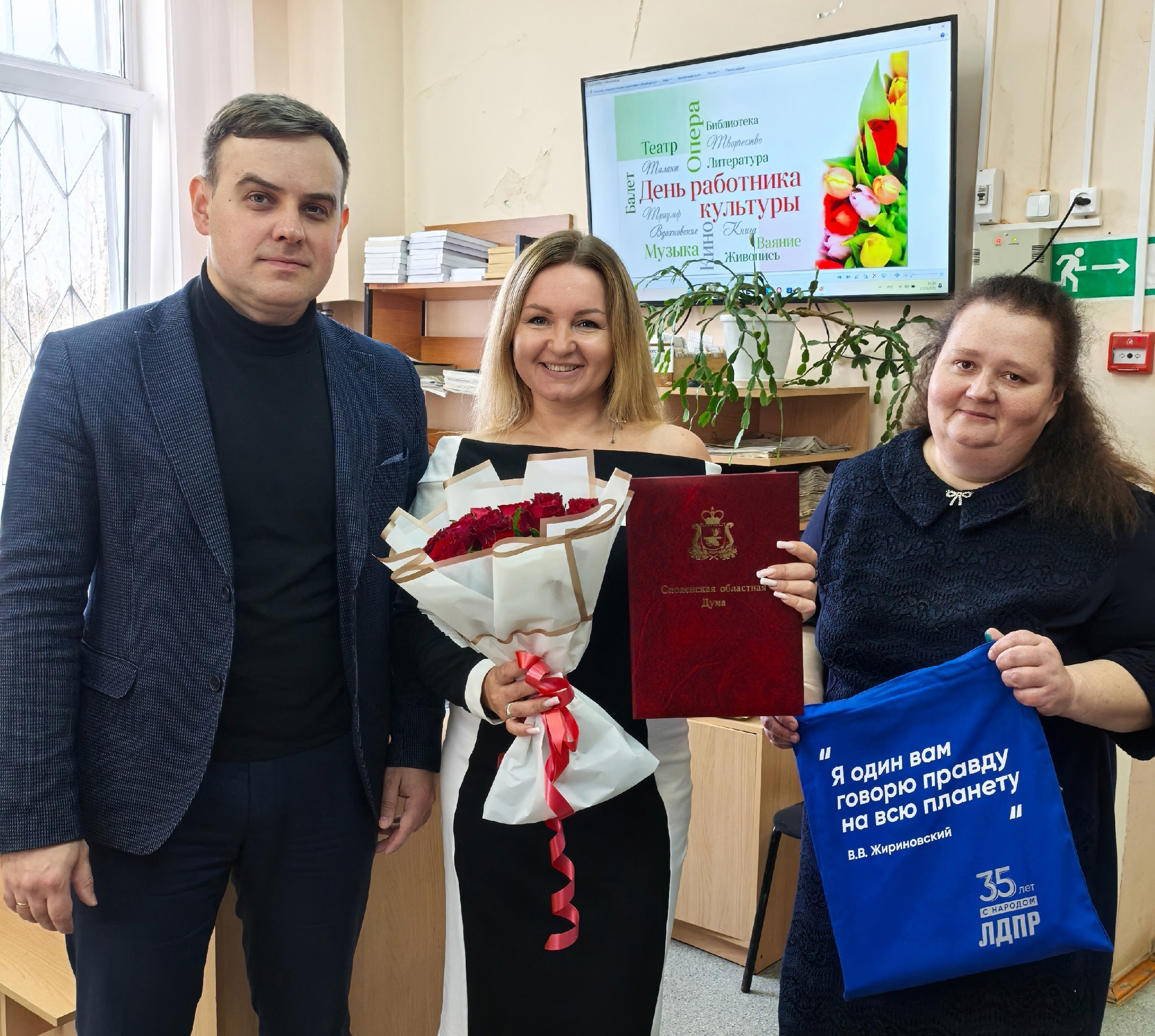 Руководитель регионального отделения ЛДПР в Смоленской области, депутат Михаил Ковалев вручил Почетную грамоту Смоленской областной Думы Ирине Зайцевой, заведующей смоленской библиотекой №6 имени В.П. Смирнова