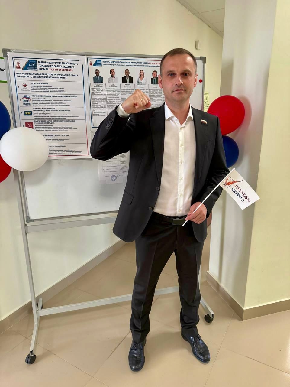 Депутат Государственной Думы Сергей Леонов принял эстафету ""Кулак Слуцкого"", сфотографировавшись на с поднятым кулаком на избирательном участке.