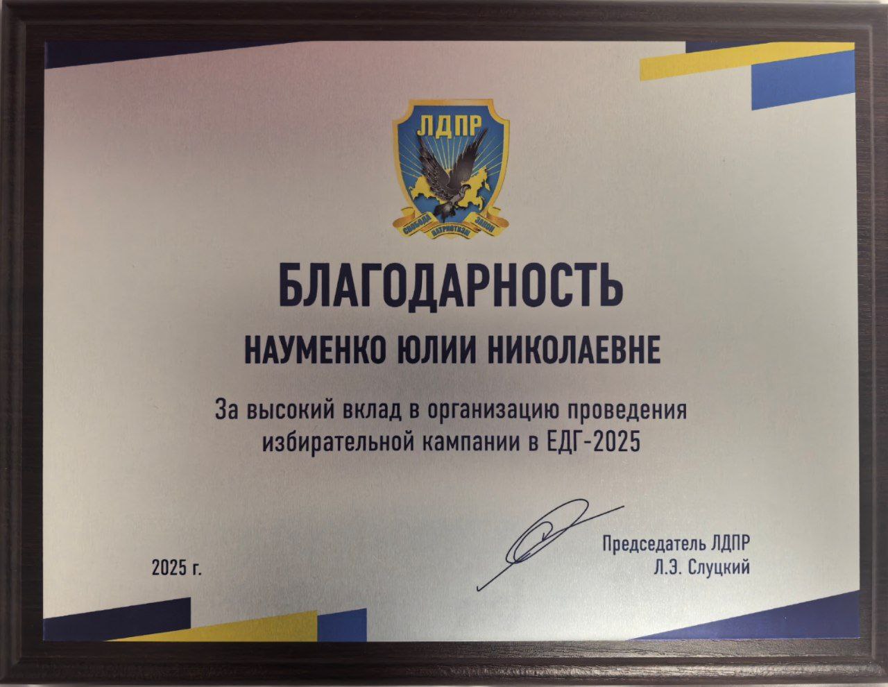 На Всероссийском Слёте ЛДПР, проходящем в эти дни в Подмосковье, в присутствии делегаций со всей страны была позитивно отмечена работа сотрудников Смоленского регионального отделения ЛДПР.Заместитель руководителя ЦА ЛДПР по сопровождению избирательных кампаний Давыд Губарь вручил координатору Смоленского реготделения ЛДПР Михаилу Ковалеву Благодарности Председателя партии Леонида Слуцкого за высокий вклад в организацию проведения избирательной кампании 2025 года для сотрудников аппарата реготделения.