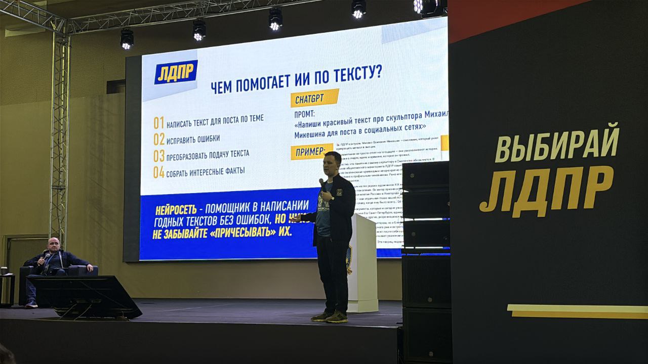 На Всероссийском слёте ЛДПР в Подмосковье с актуальным докладом выступил заместитель руководителя Смоленского регионального отделения партии Владислав Ульянов. Его презентация была посвящена практическому использованию искусственного интеллекта в публичной политике и работе с социальными сетями.