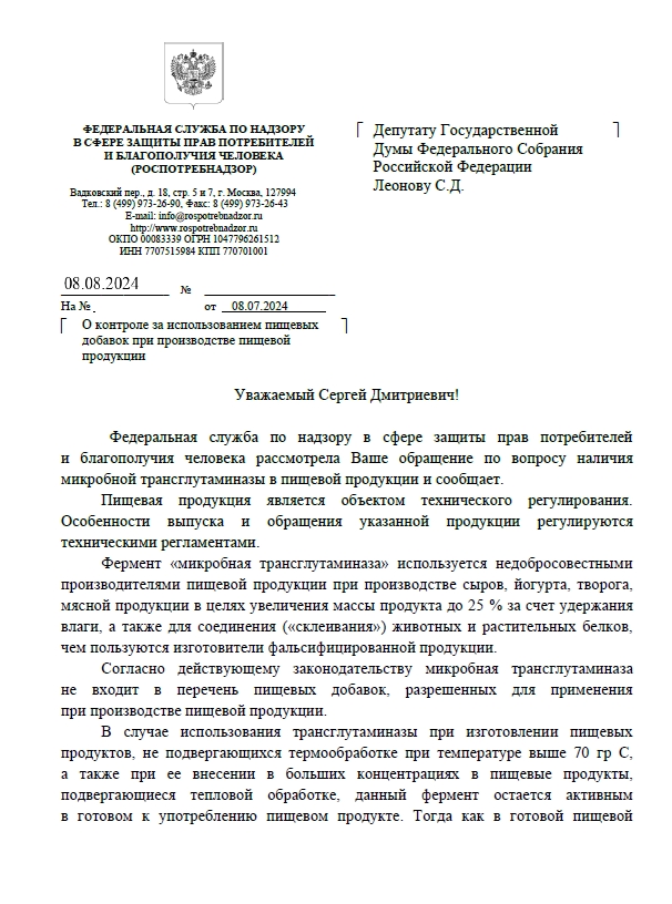 Ранее мы уже писали о том, что «мясной клей» все чаще специалисты выявляют в продуктах питания. В науке его называют «микробная трансглютаминаза». Взволнованные люди ранее уже писали в ЛДПР. По сложившейся ситуации депутат Госдумы Сергей Леонов обращался в Роспотребнадзор и получил ответ ведомства.